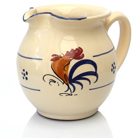 Prodotto interamente in Terracotta e smaltata color panna, la brocca ha sulla pancia dei caratteristici e semplici disegni blu che formano delle stelle insieme al tipico disegno del gallo.