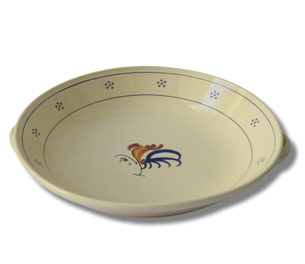 Realizzato interamente in Terracotta, L'Azienda Colì ha scelto per il Centrotavola della Linea Gallo uno smalto bianco come segno di genuinità. Per un tocco di colore le decorazioni blu, che seguono le forme del piatto, sono realizzato interamente a mano così come le piccole stelle, dettagli che rendono ogni piatto unico. Come tutti i prodotti dell'Azienda Colì, tutti gli smalti ed i colori utilizzati sono apiombici, quindi garantiti per uso alimentare, anche il Centrotavola basso Gallo può essere lavato in lavastoviglie e utilizzato in forno a microonde.