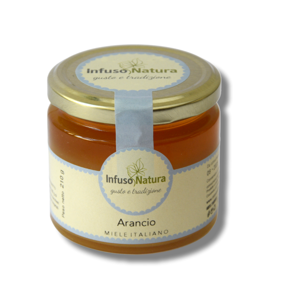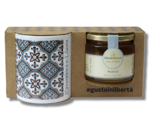 In abbinamento un vasetto di miele all'arancia da 210 gr. Il miele di arancio ha un sapore delicato ma marcatamente aromatico, ottimo per dolcificare il tè e le tisane in inverno. Qualità, nutrimento e piacere sono gli attributi che fanno del miele di arancio un prodotto di eccellenza. Il processo artigianale della raccolta del miele preserva il sapore, l'aroma intenso e ricercato dell'arancio, il profumo e le sue inaspettate sfumature che stuzzicano le papille gustative.