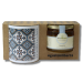 Elegante kit in confezione regalo per la colazione o per una tisana in compagnia con elegante tazza decorata con il tema delle classiche maioliche Salentine.