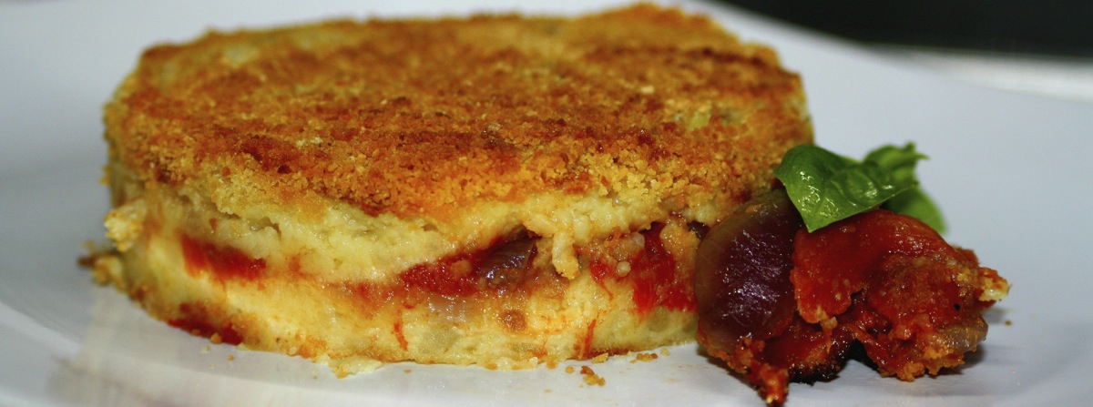 Dopo aver lessato, pelato e schiacciato le patate si condiscono con olio menta sale pepe e si aggiungono le uova. Impastare il tutto con le mani, consiglio di bagnare le mani per non far appiccicare l’impasto. Per il ripieno si fa un abbondante soffritto di cipolla in poco olio, aggiungere pomodori pelati e far cuocere per 10 minuti. Togliere dal fuoco e aggiungere capperi, olive nere snocciolate, peperoni sottaceto e cetrioli. Ungiamo la teglia e con metà dell’impasto di patate facciamo il primo strato, versiamo il ripieno e copriamo il tutto con la rimanente parte dell’impasto, facciamo un giro d’olio una spolverata di pan grattato e inforniamo in forno preriscaldato a 200° statico per 50 minuti. A proprio gusto, nel ripieno andrebbe bene aggiungere degli alicetti salati.