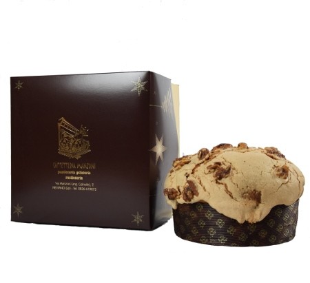 Panettone artiginale realizzato con sole materie prime di alta qualità. Il lievito madre e la lunga lievitazione garantiscono un prodotto soffice e genuino, come vuole la tradizione. Nell'assaggio sorprende il sapore croccante delle noci che avvolge la dolcezza dei fichi, un equilibrio di sapori e sensazioni che non stanca il palato...anzi, lo sorprende. La confezione color oro custodisce questo delizioso dolce preservandone la fragranza e la freschezza per portare a tavola un trionfo di profumi e sapori tipici natalizi.