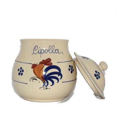 Il barattolo Porta Cipolla è realizzato da esperti artigiani salentini in terracotta. Decorato con la figura del "Gallo", dai colori vivaci, affiancata a delle piccole stelline.