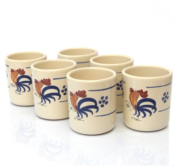 Bicchiere cilindrico senza manici per acqua o vino linea Gallo dell'Azienda Nuova Colì. Questa stoviglie in terracotta si presenta dal design semplice e intramontabile. Ogni pezzo realizzato dalle mani degli artigiani, viene smaltato color panna e decorato con le tipiche figure delle stelline blu e del gallo, segni di riconoscimento tradizionali delle maioliche pugliesi. Le piccole irregolarità si trasformano in una caratteristica creativa del design e l’accurato procedimento artigianale rende ogni stoviglia un pezzo unico.