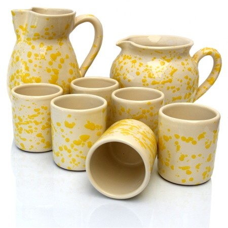Prodotto interamente in Terracotta, l'Azienda Colì ha scelto per il set brocche e bicchieri della Linea Screziati uno smalto bianco come segno di genuinità e il giallo per un tocco di colore all'insegna della fantasia con le sue con screzziature. I disegni sono realizzati artigianalmente rendendo il Set Bicchieri unico.