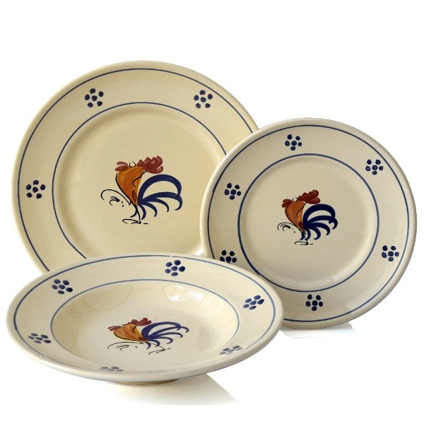 Il Set da Tavola in Terracotta della linea Gallo è una combinazione di prodotti realizzati esclusivamente dall'Azienda F.lli Colì, è un idea regalo originale e inoltre stuzzica la curiosità nell'apparecchiare tavola in stile autentico e country. Tutti i prodotti sono realizzati in Terracotta, materiale resistente e naturale, inoltre gli oggetti del set in terracotta “Gallo” dell’azienda Colì sono smaltati uno ad uno e decorati a mano, con la rappresentazione della tipica figura del “Gallo”, simbolo di virilità, accompagnata da una decorazione di sei stelline azzurre disposte a rappresentare un fiore. Come tutti i prodotti dell'Azienda F.lli Colì, gli smalti ed i colori utilizzati sono apiombici, quindi garantiti per uso alimentare, inoltre possono essere lavati in lavastoviglie e utilizzati in forno a microonde.