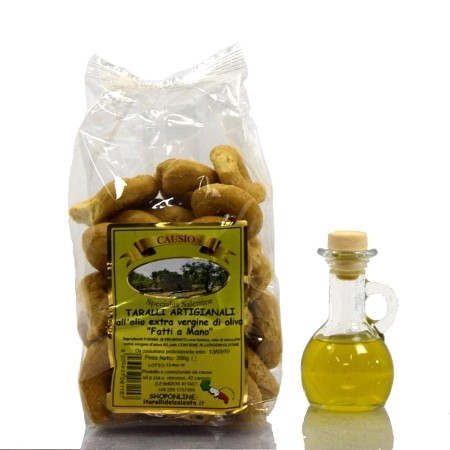 Dalla forma irregolare, i Taralli all'olio extravergine di oliva sono un prodotto artigianale di qualità, incredibilmente gustoso, friabile e croccante. I Taralli pugliesi sono particolarmente prelibati, grazie alla qualità dell’olio, proveniente dagli uliveti del territorio locale.