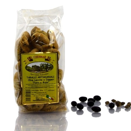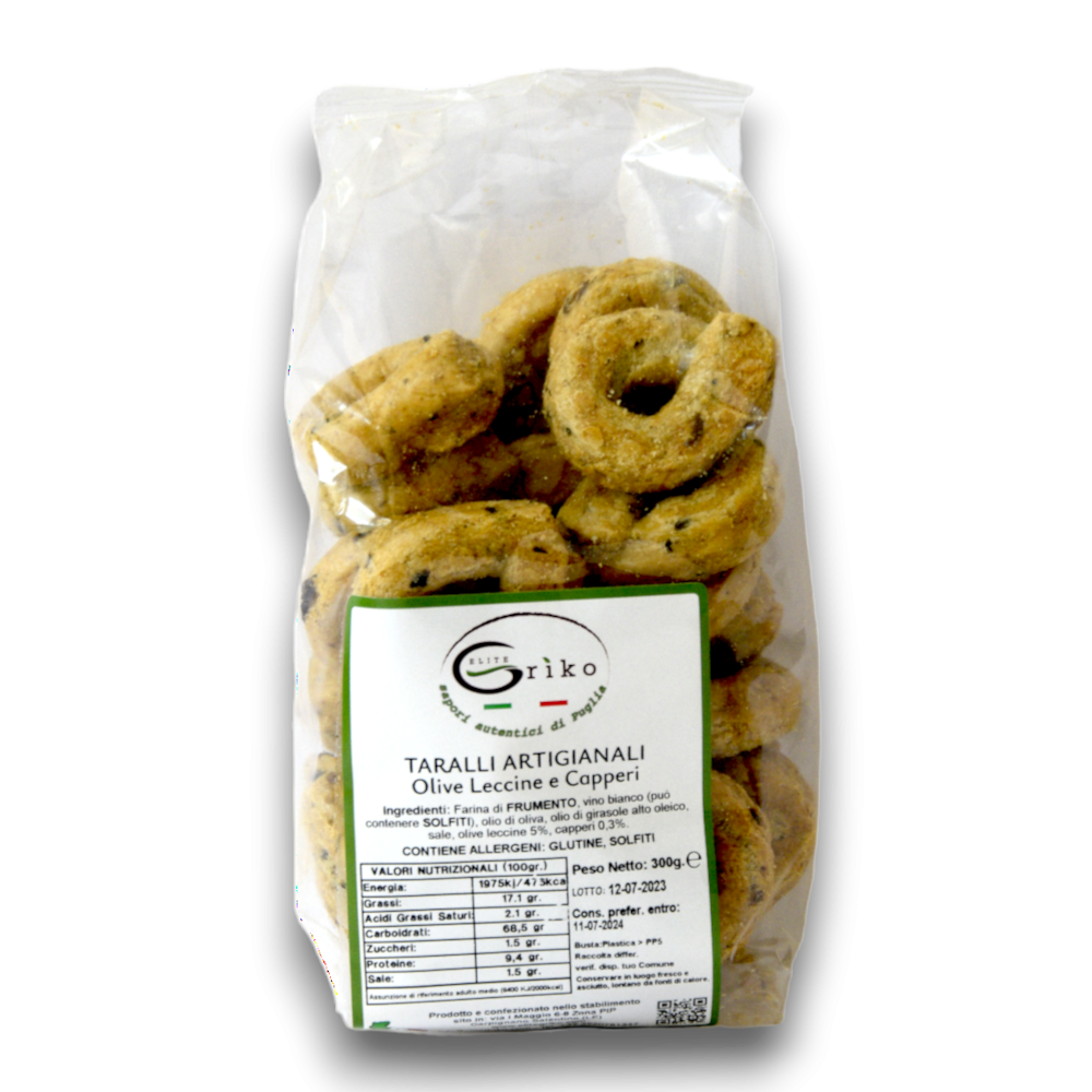 I Taralli Olive Leccine e Capperi realizzati abilmente a mano, seguendo la ricetta tradizionale, sono dalla consistenza croccante e friabile.